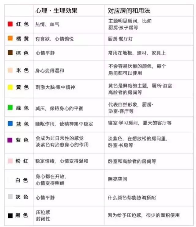 根据颜色的不同,房间的感官和心情得以变化。运用这些用途,优化色彩组合,能够最大限度地利用颜色效果,来创造老人舒适的住宅环境。如何搭配及运用这些色彩则是靠设计师下功夫了,不做风格讨论:比如「米色」是最接近皮肤色及剥开树皮里的木肌色,最易使人感觉放松,所以很多布类沙发、榻榻米则多用于此。所以尽量少用黯淡色,另外地毯的使用也是能提升空间温度感。