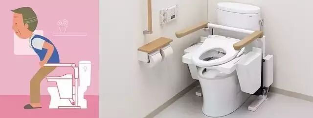传统马桶较低,老人站立起较费力,所以可以用辅高坐垫来增加5cm马桶的高度!(图片是电动的,辅高便圈则很廉价);另外马桶两侧的把手使得老人如厕时有支力点。