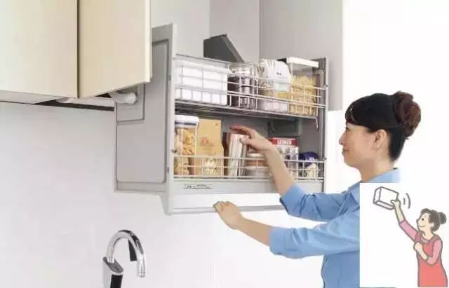 橱柜五金:橱房吊柜推荐使用升降类五金,减少踮起脚时平衡不当的危险(避免爬高),收纳应满足手方便拿取的设计。