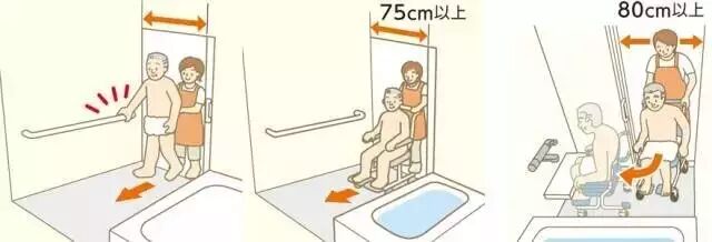 直接进入浴室时,需75cm以上;当进入需迂回时,门开尺寸至少80cm以上(洗浴过道容身处亦大于80cm);进入浴室路上应没有障碍。